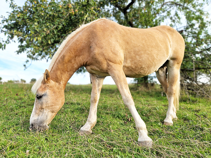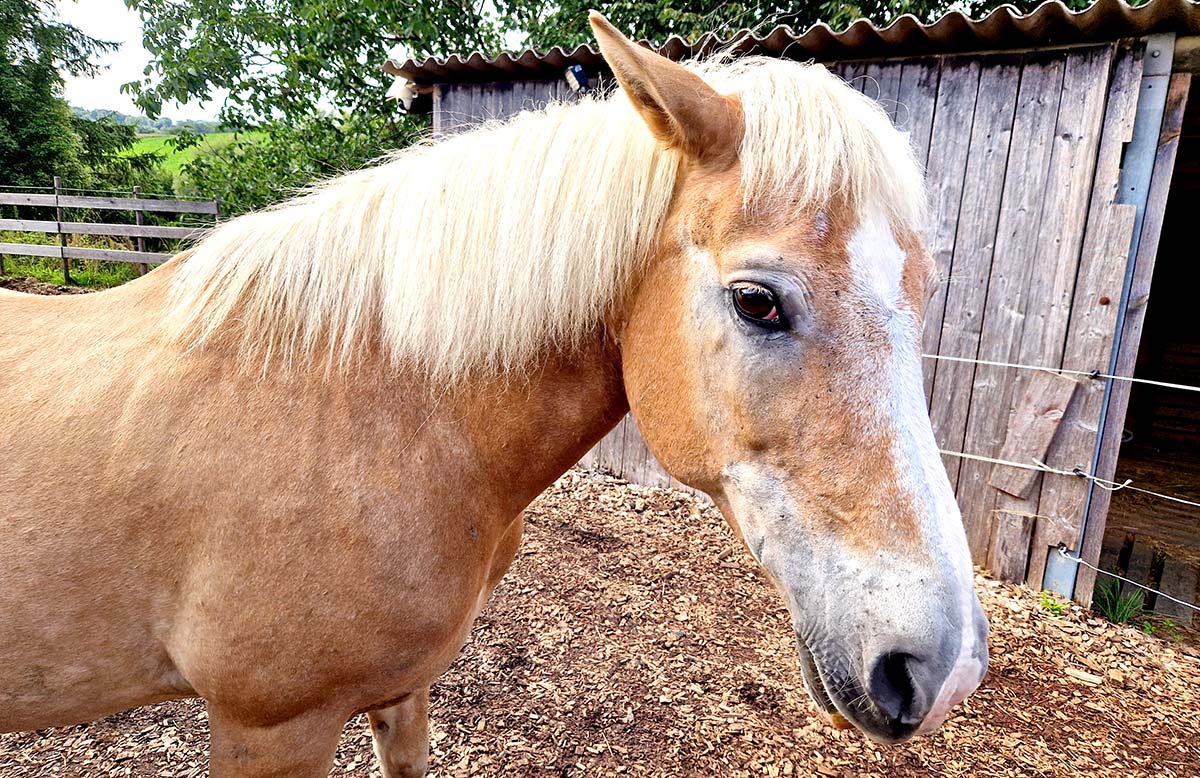 Seit Juli bereichert Nelli unsere bunte Gnadenhof-Familie. Die 22‑jährige Haflinger-Stute ist total lieb, ruhig und zurückhaltend, eher rangniedrig und harmoniebedacht. Bevor sie zu uns kam, lebte Nelli als Therapiepferd auf einer Jugendranch. Kinder und Pädagogik kannte sie also bestens – aber unsere Gnadenhof-Herde war Neuland. Sie versuchte jedem Streit aus dem Weg zu gehen; aber gerade bei Rambo und Bonita gelang das nicht immer. Entsprechend war ihr Start nicht leicht und Nelli zog anfangs öfter den Kürzeren.
